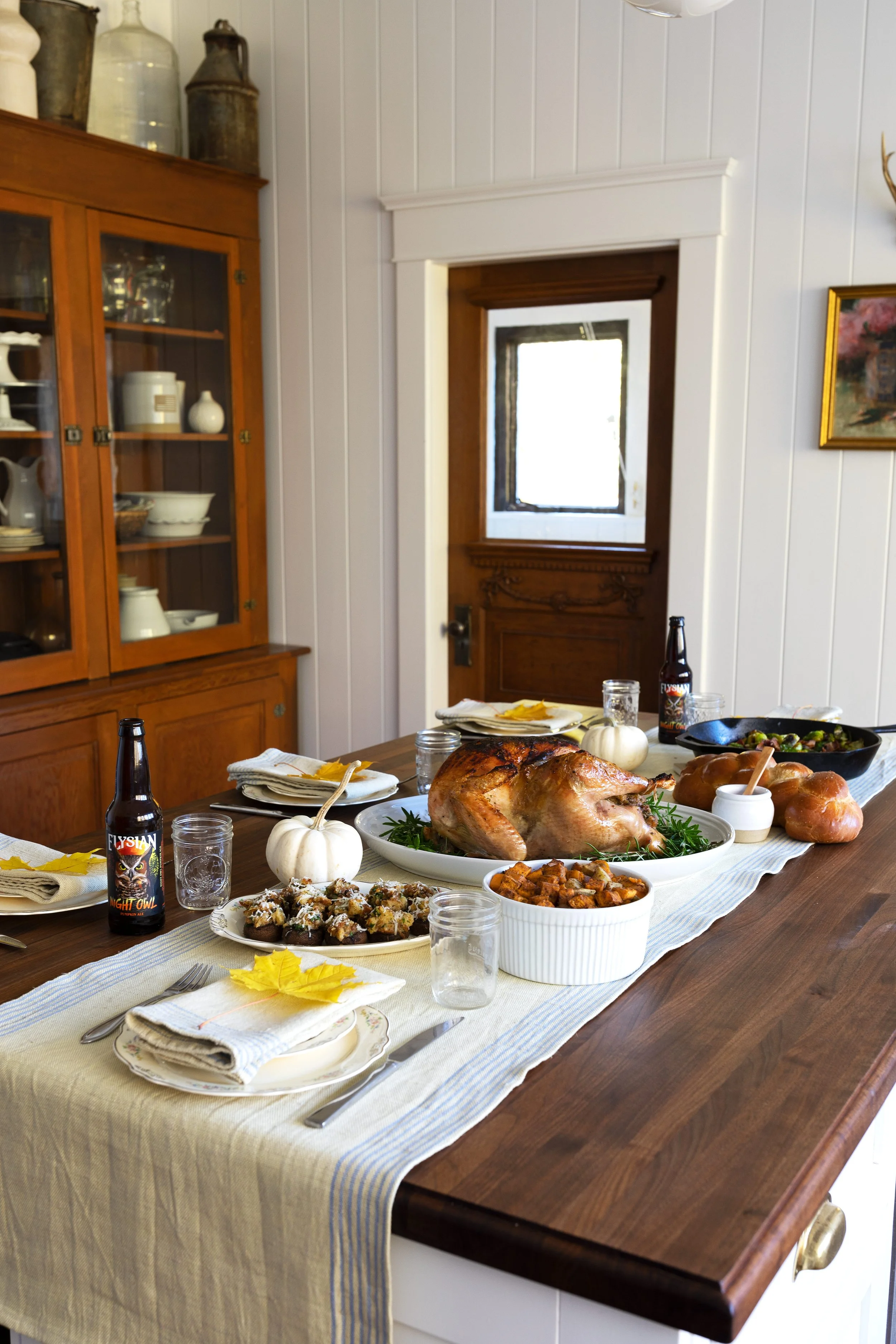 We are far from fancy around here, but I do love to set a low-key, un-cluttered (except with food!) table at holidays. With kids, I’ve found less is more so kept it simple with linen napkins, a table runner, and my great grandmother’s china, which is about as formal as we get ;). For a little festive touch, I added a leaf from our yard to each place setting. And yes, in case you’re wondering, we often eat in the kitchen when it’s just the 5 of us. I really love the intimacy of it!