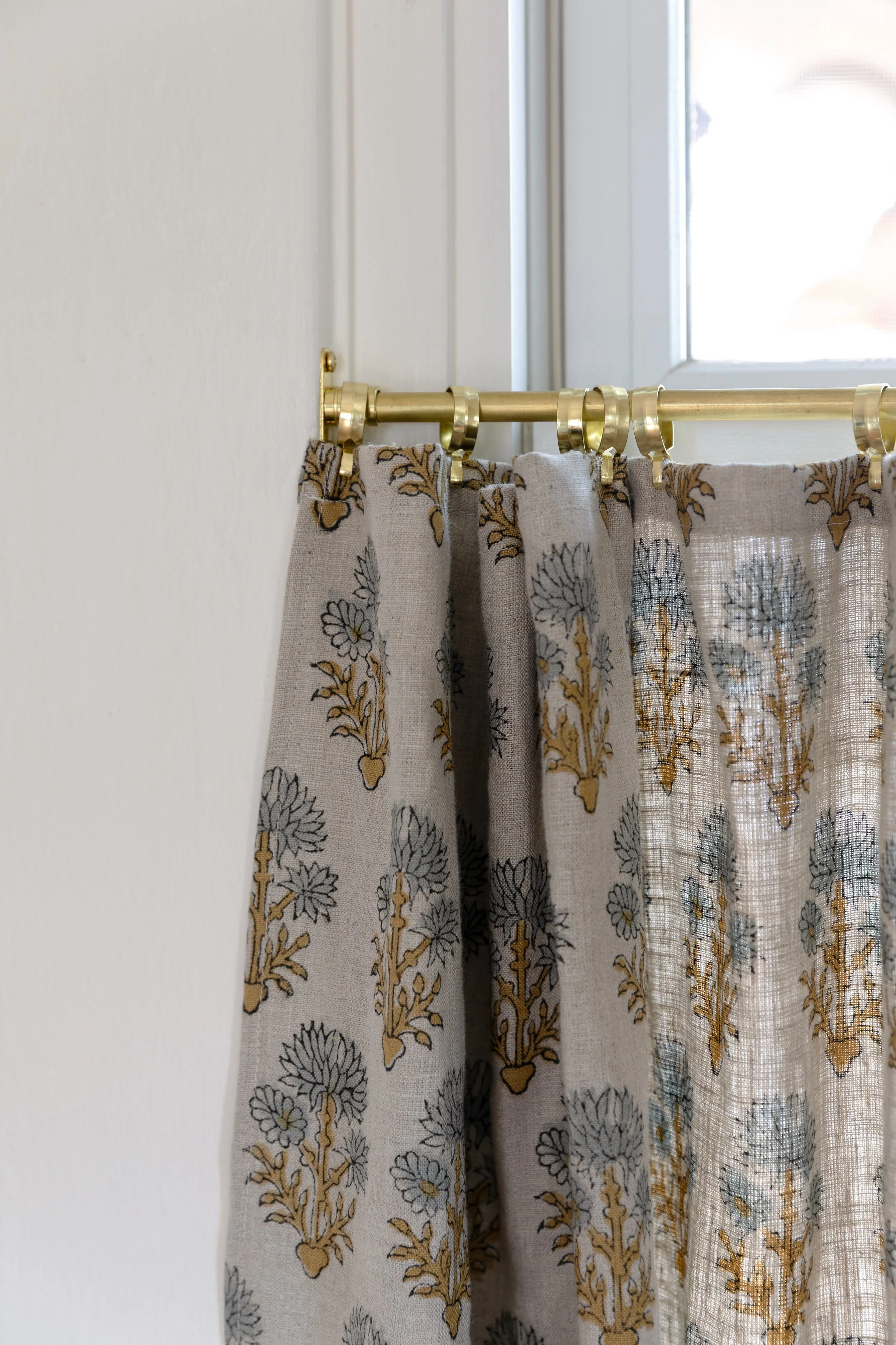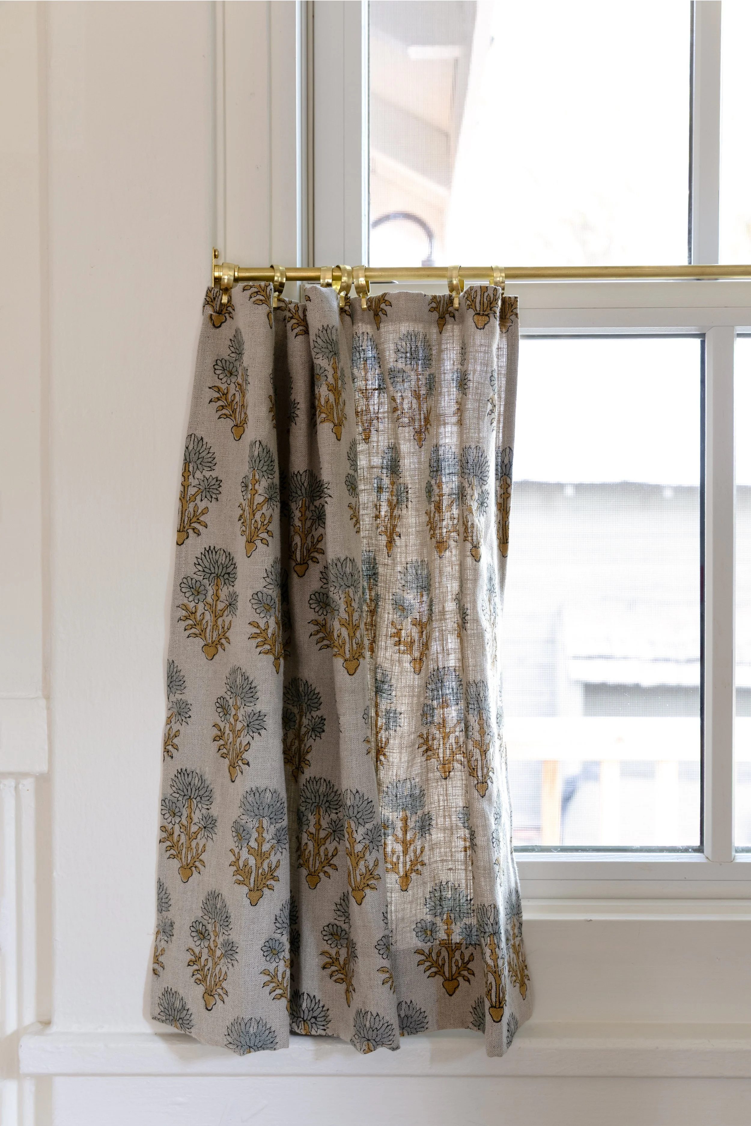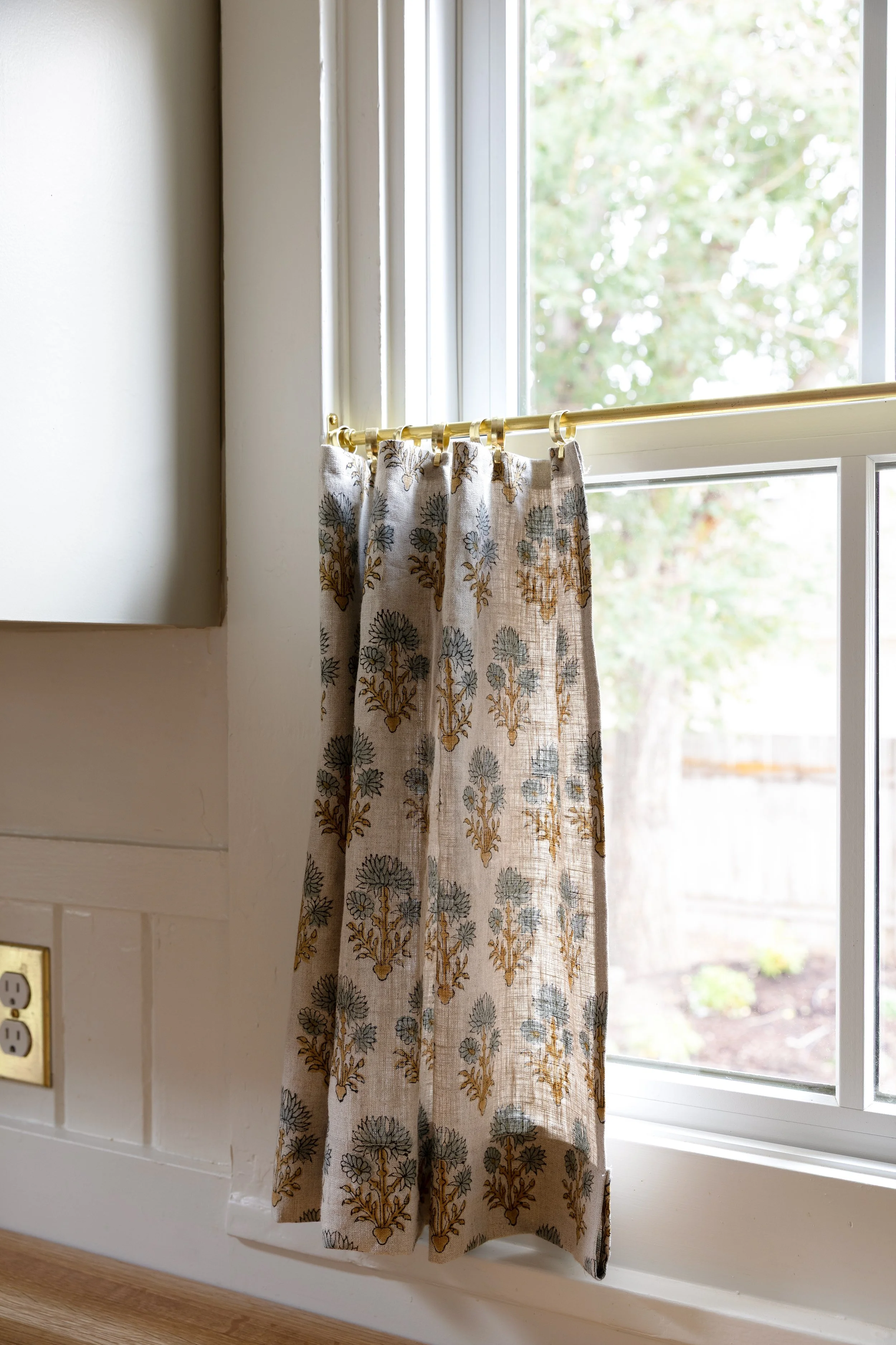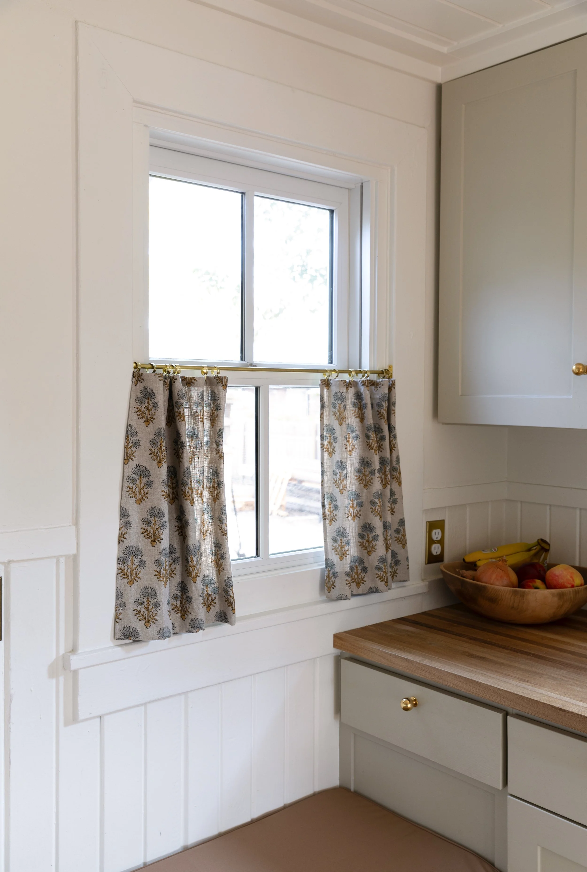 For the Poplar Cottage kitchen, we used a block-print linen fabric handmade in India (Etsy is the BEST resource for fabric!). It’s thick enough to give us privacy at night but still lets light pour in during the day. My mom sewed them to fit our windows exactly, and I hung them with small brass café clips on a slim brass rod. Everything was ordered online and made at home.