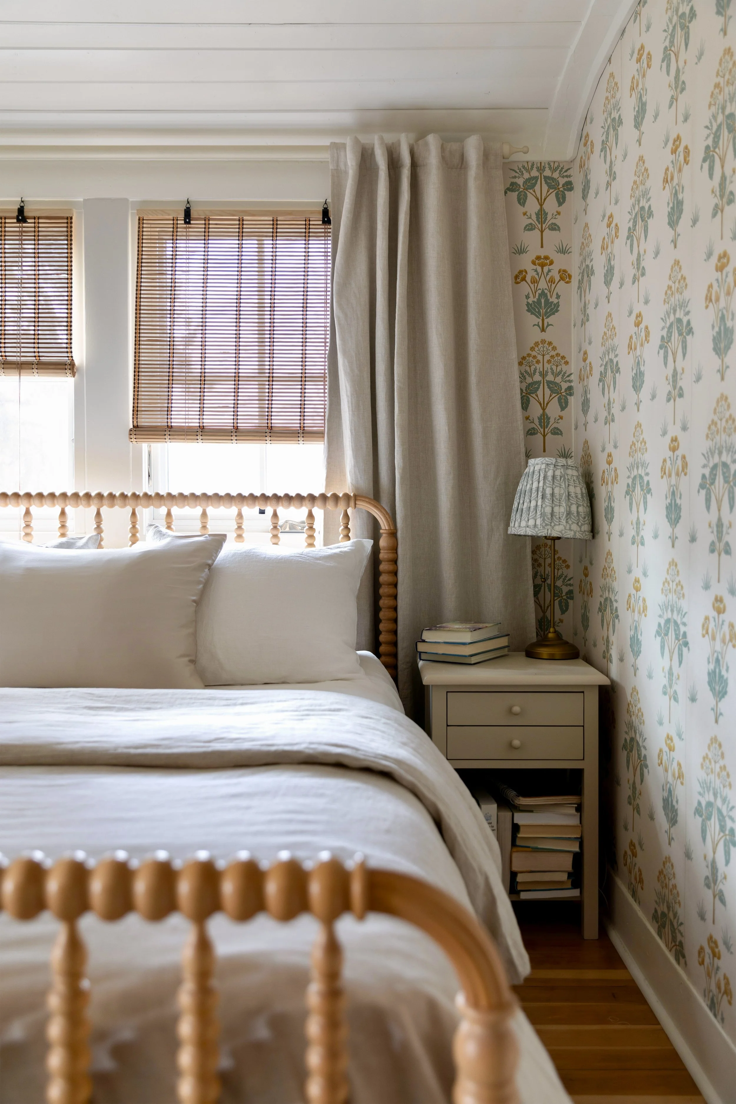 Poplar Cottage bedroom | Jenny Lind bed with linen duvet, linen sheets, and silk pillowcase