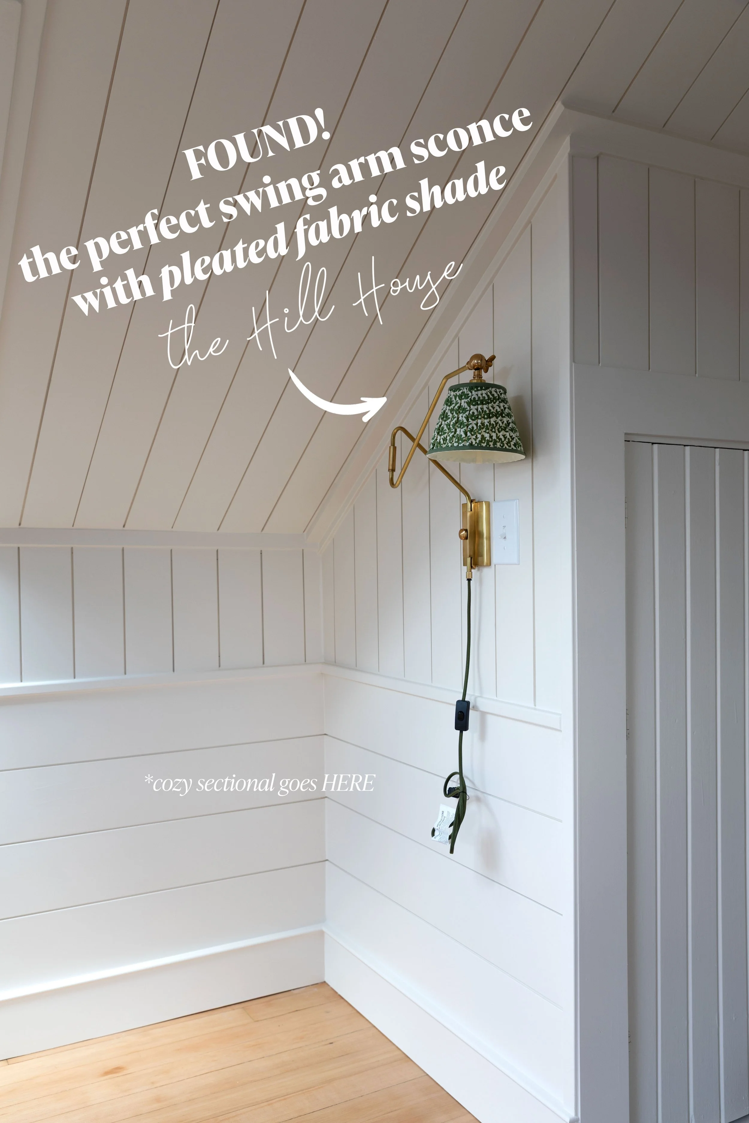 Happy Friday! We had a little wifi hiccup over here this week, so just one post, but we’re officially back online! I’ll admit, the unplugged stretch was kind of nice - more board games, less work, and no one seemed too upset about it. Anywho, in between all that, we installed the perfect swing-arm sconce in the snug up at the Hill House and I have to show it to you. It’s a little whimsical, pulls out like a proper reading light, and has the prettiest pleated fabric shade. Exactly the kind of light I was hoping to find for our cozy snug.