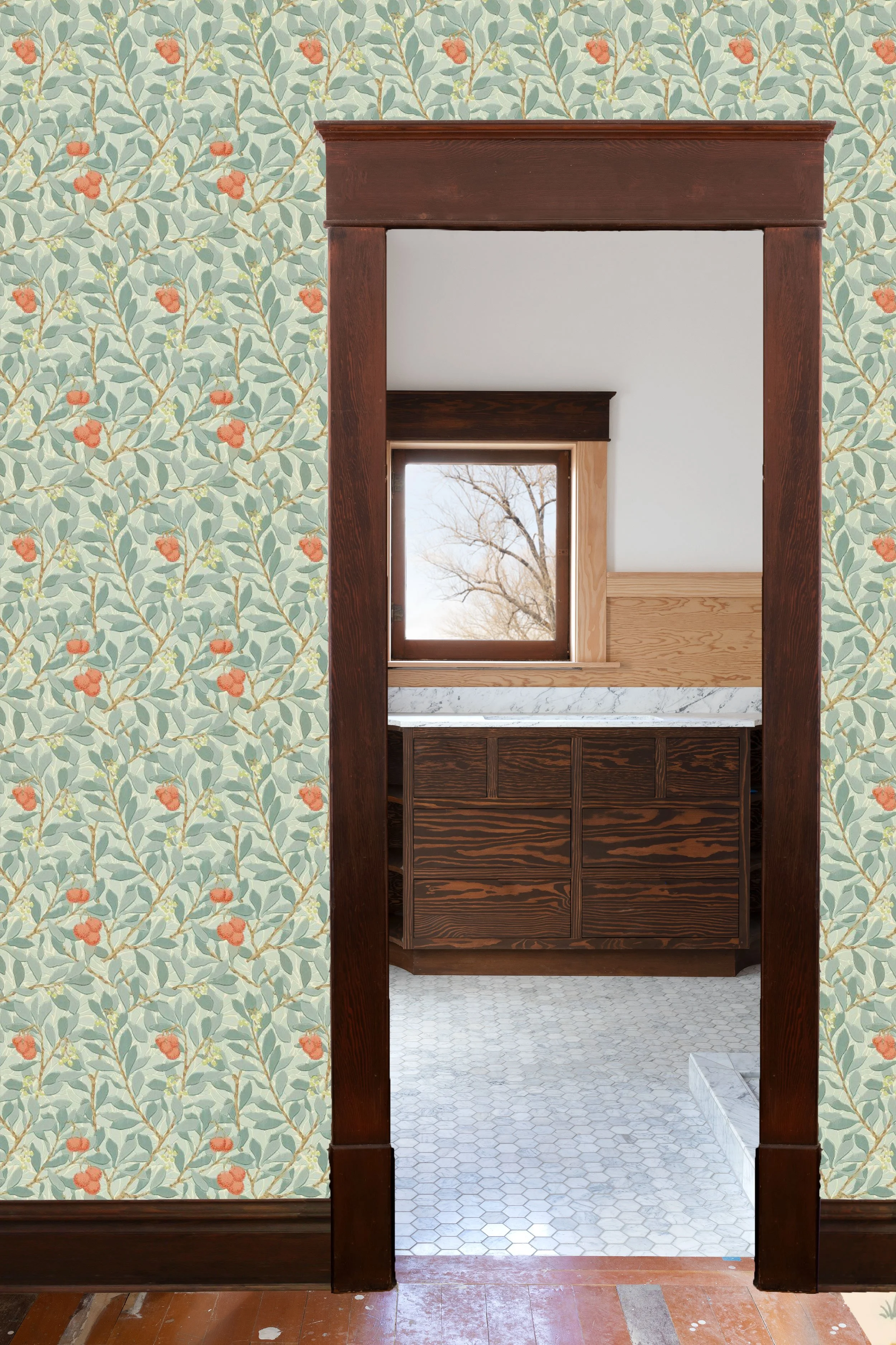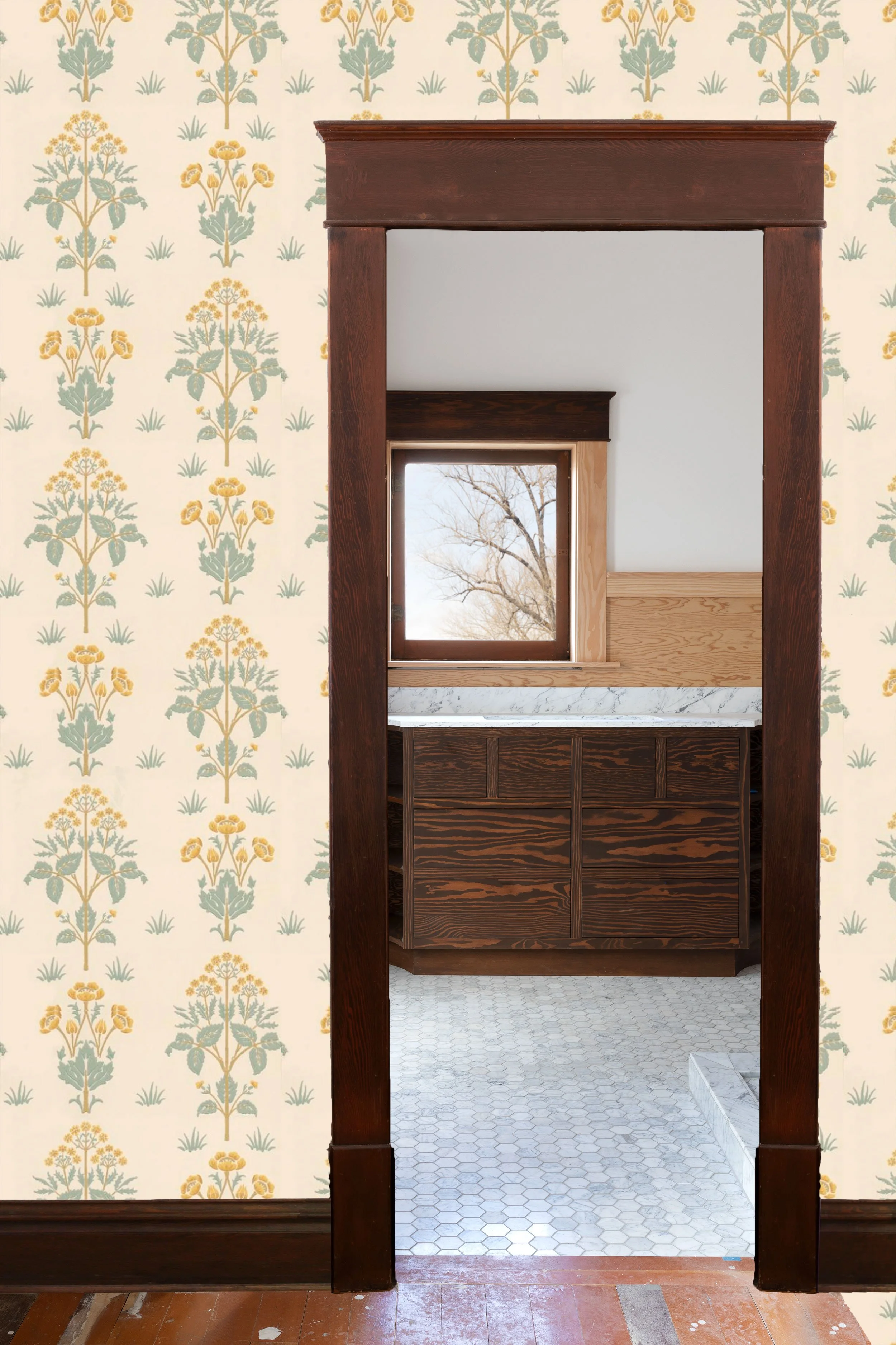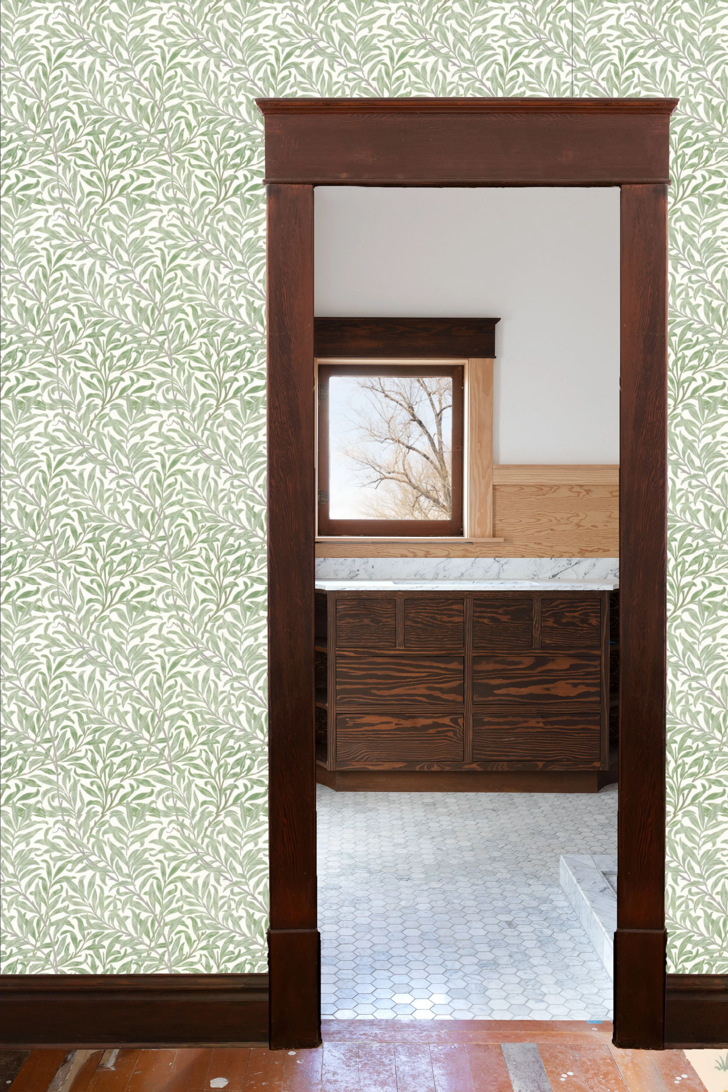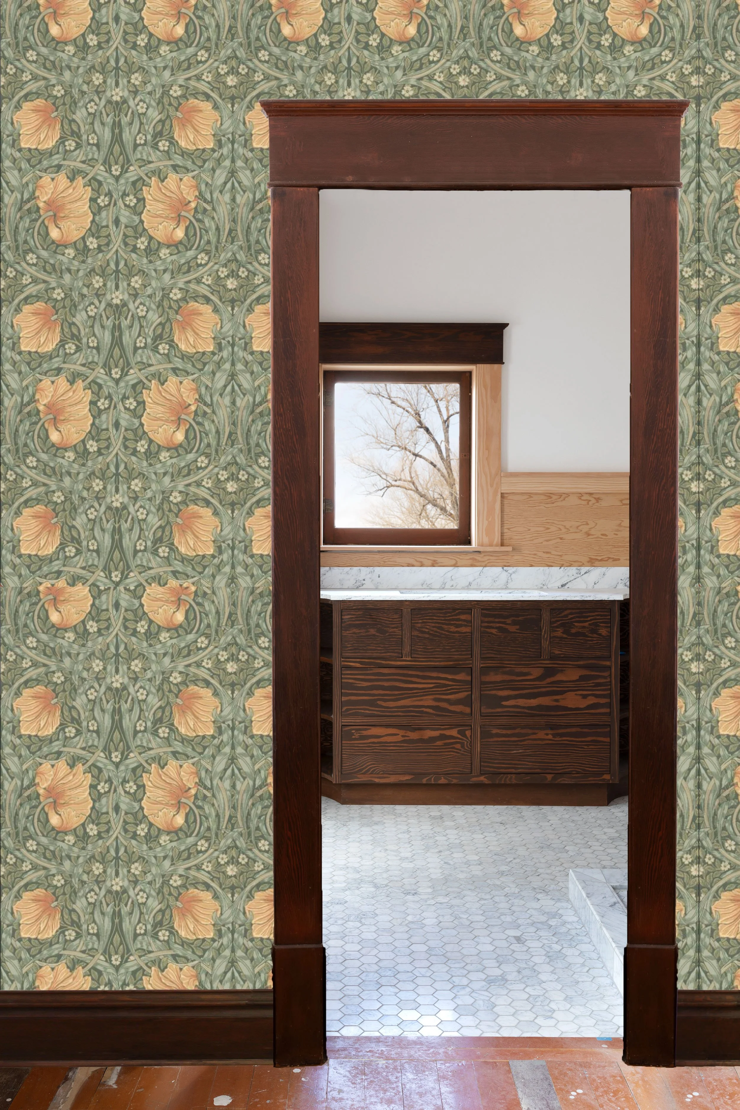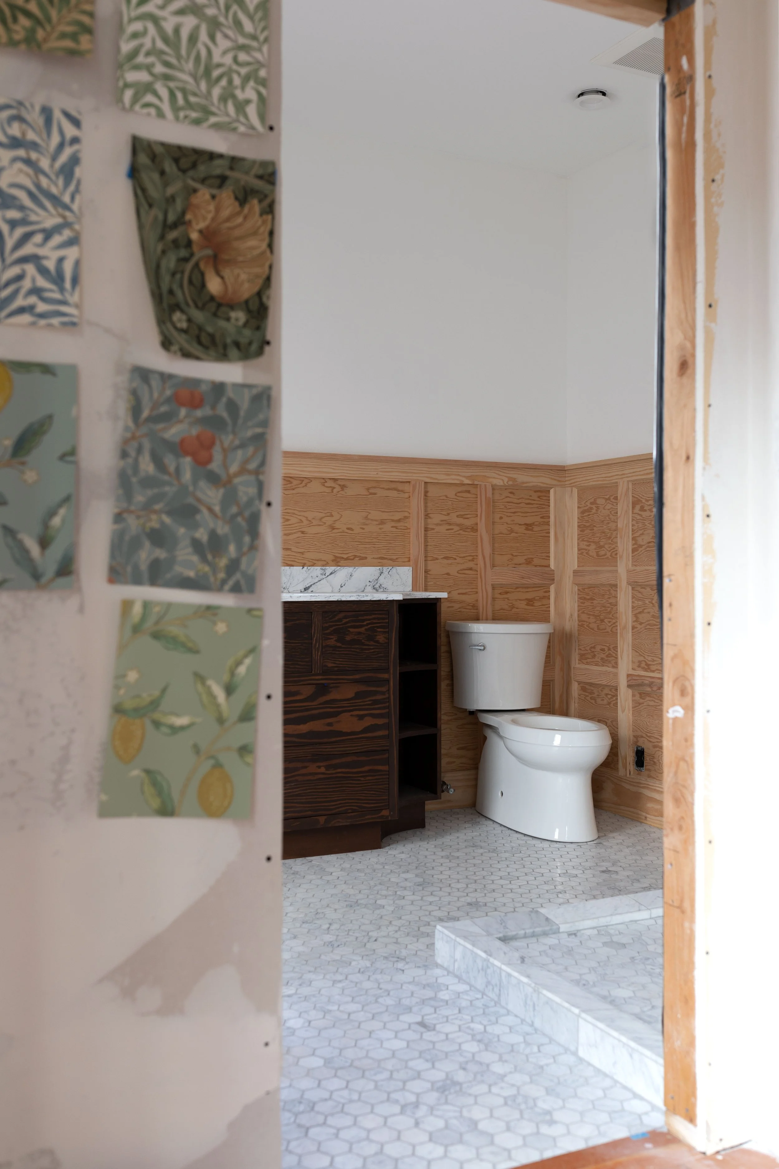 Liking a paper is more of a gut thing IMO, but liking a paper for a certain space means taking a few things into consideration and I wanted to walk you through those… First, our bathroom design is gloriously simple - white, wood, and marble - so some color and a bolder print will work well in here. The bathroom walls are already painted in BM Simply White (it’s our go-go white and we don’t even have to think about it) and all the wood will be stained dark like the vanity and window. We have plenty of natural daylight in here, mostly west-facing. And the tile floors are carrara marble while the nook’s fir floors will remain wood - a refinish and clear sealer are in order, so you can expect those to end up lighter and less-orange. What I’m looking for in a paper is something warm and welcoming - a soft element against all those bathroom finishes. I was drawn to the green tones, but blue looks pretty in here too.