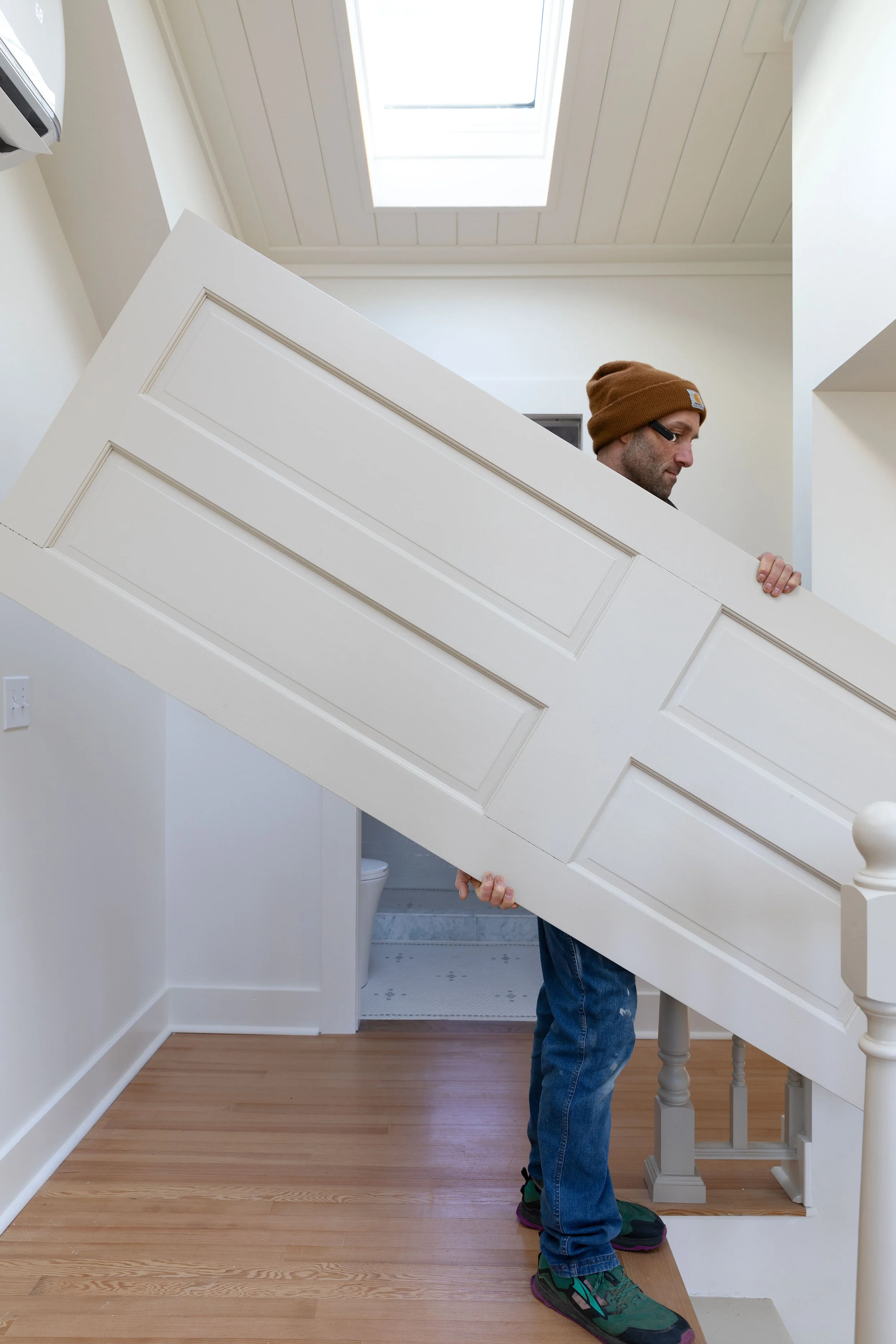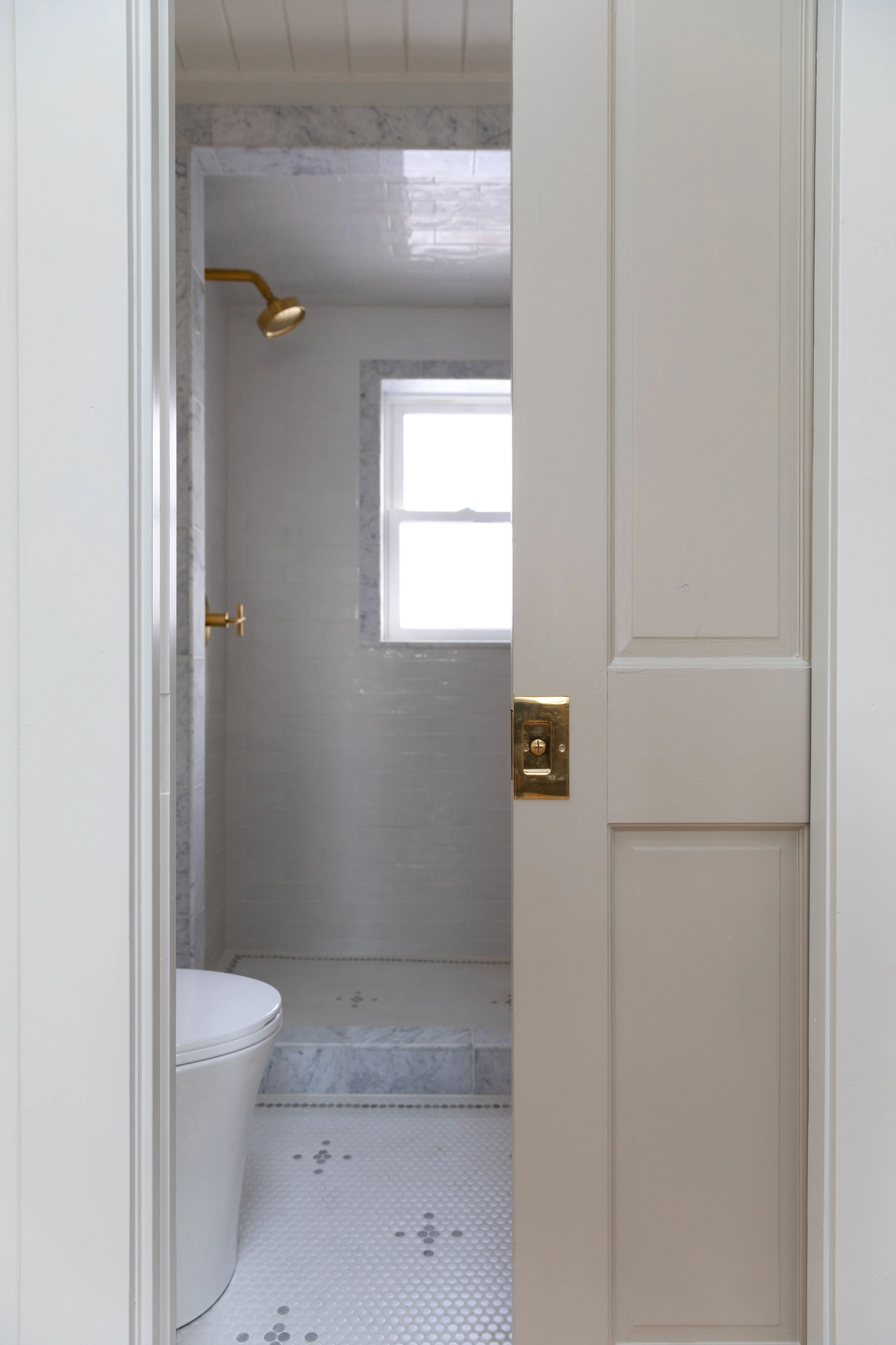 When it comes to small old houses, pocket doors are miracle workers! They don’t take up any room. And that’s exactly what we needed in our tiny, 42sf upstairs bathroom at the Poplar Cottage. Notice the edge of the toilet peaking through the doorway - it’s a tiny bathroom! Today Garrett is walking through his process for framing and hanging a pocket door, including the kit he likes that fits into a standard 2x4” wall.