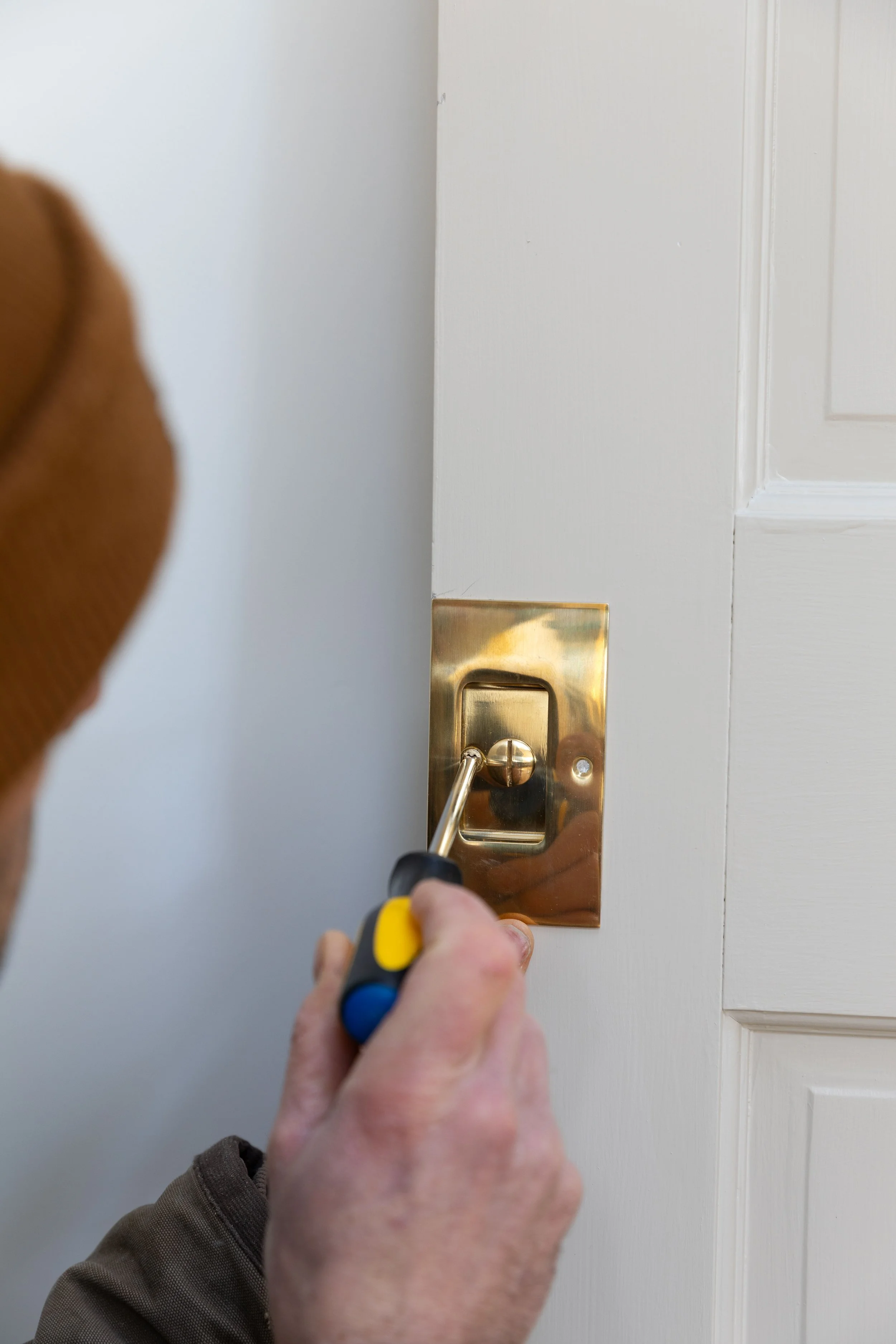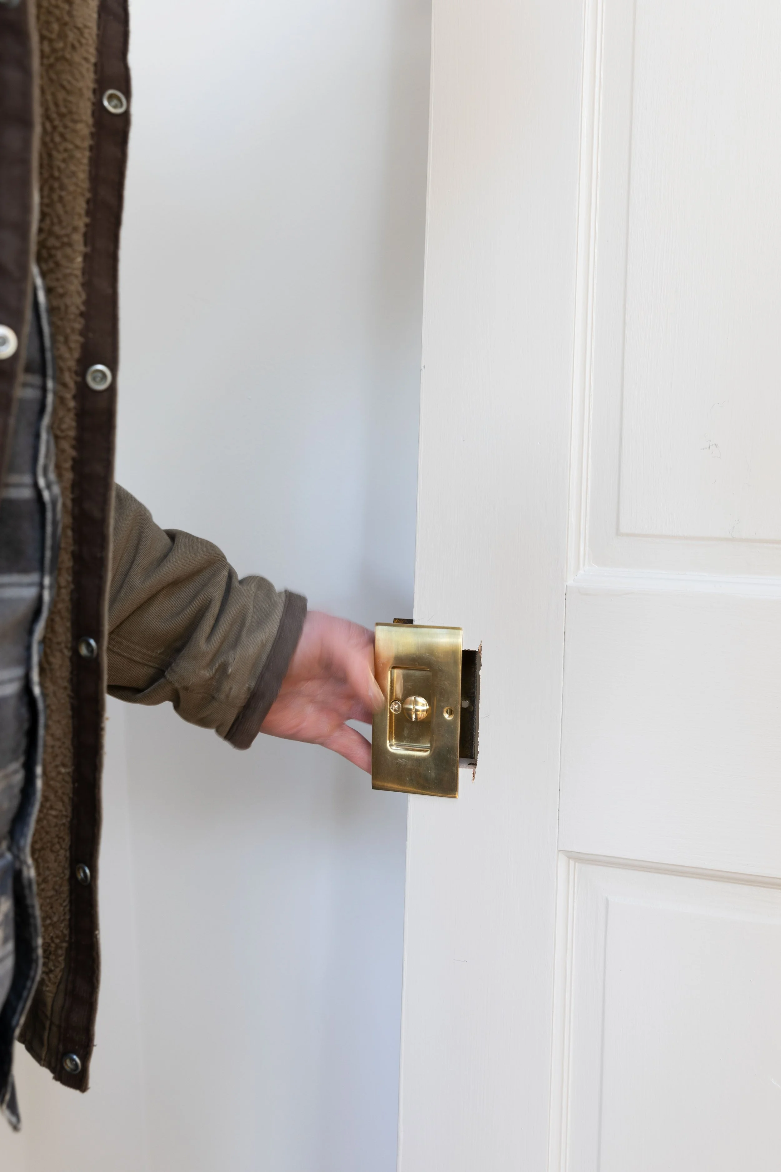 Open and close your door a few times with the latch engaged to see where the door hits the jamb. Make sure the door is hanging still and in alignment when you finalize the strike position. Once we had the strike positioned using the door hardware as our guide, we used a router to carve out a divot behind the strike for the catch to swing into. Then the strike was installed with a couple of screws.