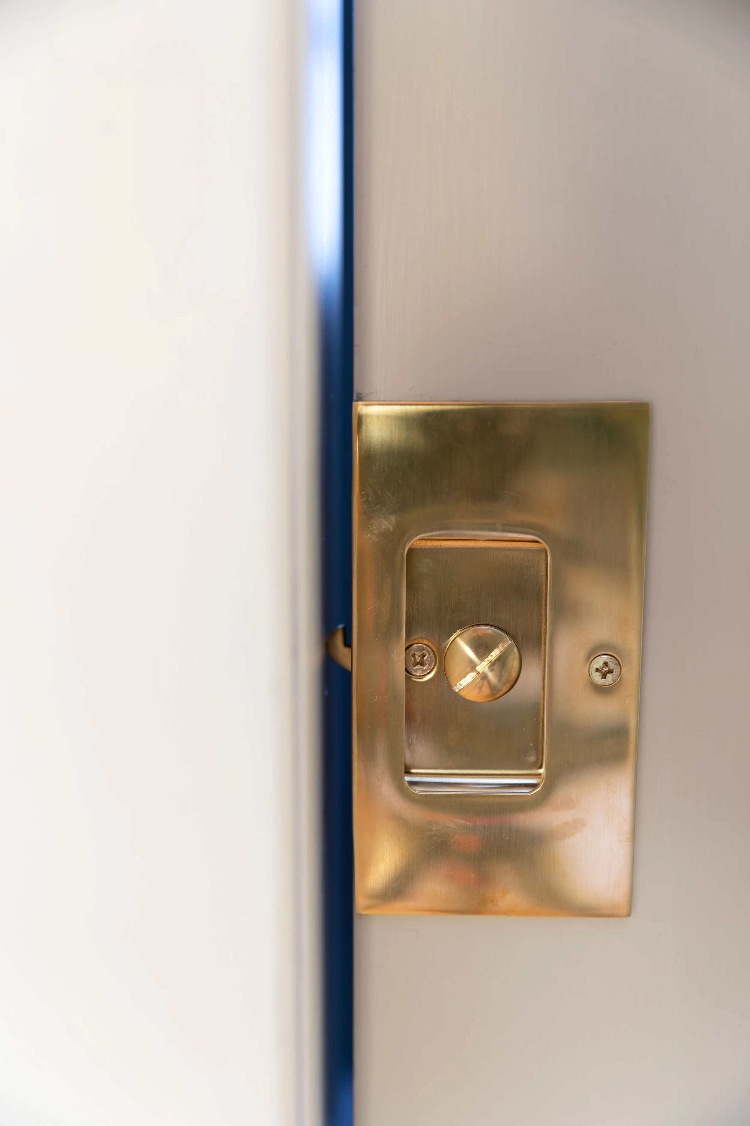 Now that the door is ready, it was time to install the hardware. Cathy fell head over heels for this pocket door set awhile back. It comes in unlaquered brass and is really solid. To install it, we took the door outside and followed the manufacturer’s instructions, which was essentially to cut out a rectangle out of the edge of the door where the hardware will sit. Hot tip: squares are easier to cut out of doors than circles!
