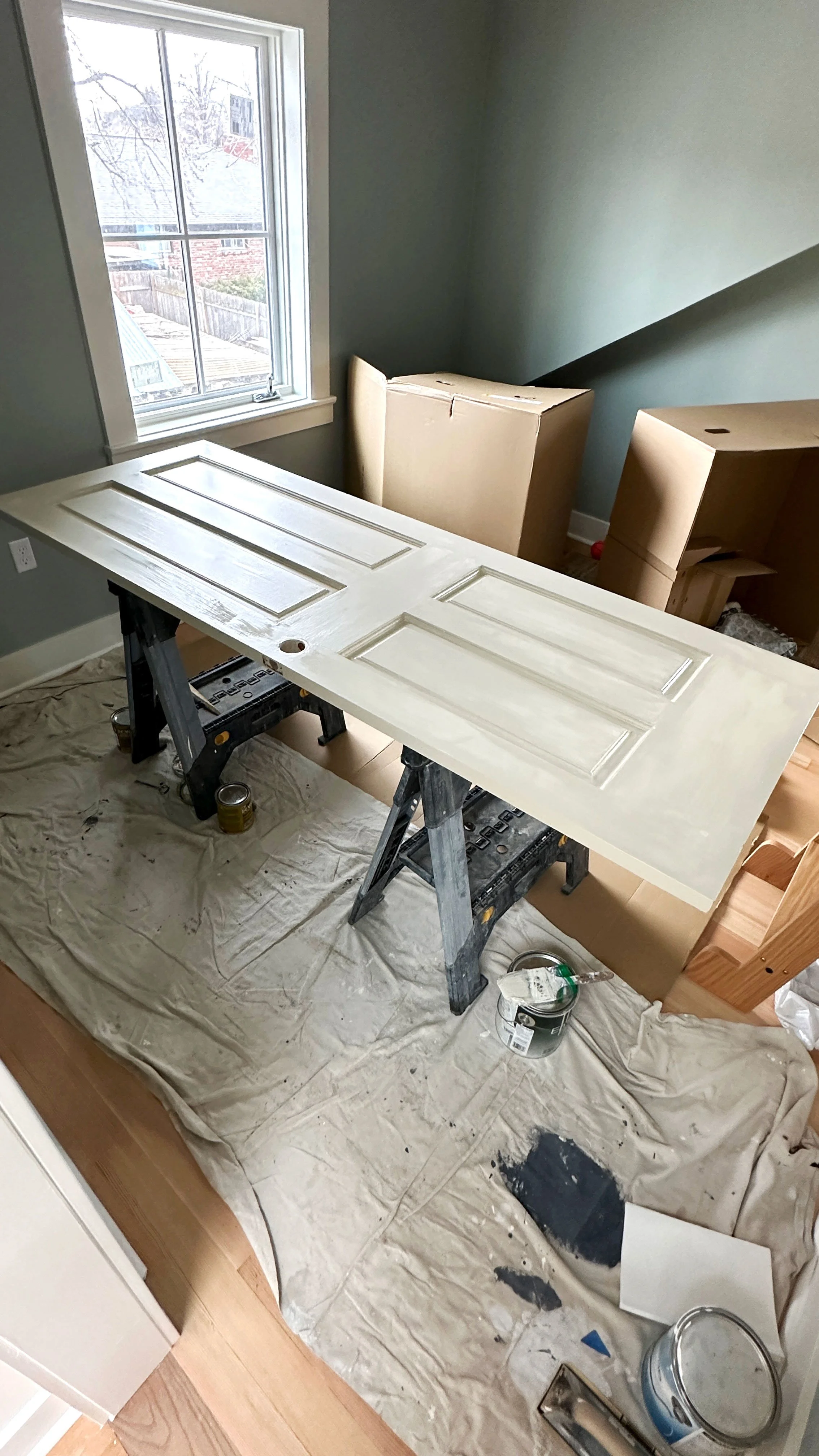 We found this solid door at a salvage shop in Seattle for $60 and then sanded, primed, and painted it. It was originally a pocket door so was easily freshened up to use here.