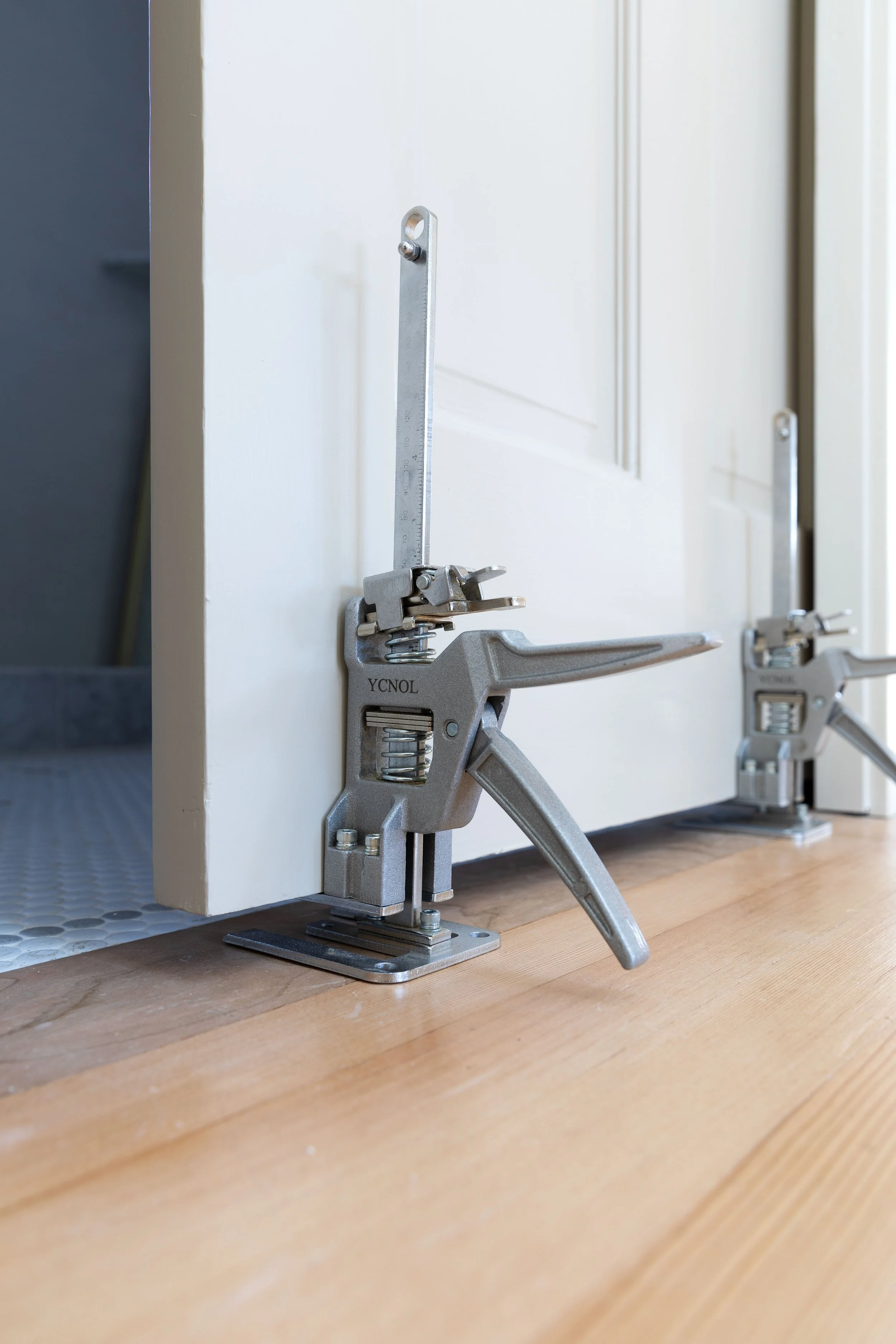 Connecting the hanging brackets to the trolley studs can be a little tricky. Highly recommend using a couple toe jacks to easily lift and adjust the door height. Once you get the brackets clicked in, you can dial in the overall height as well as the cant of the door using the special angled wrench to turn the studs. Note that the angled wrench comes with the pocket door kit.