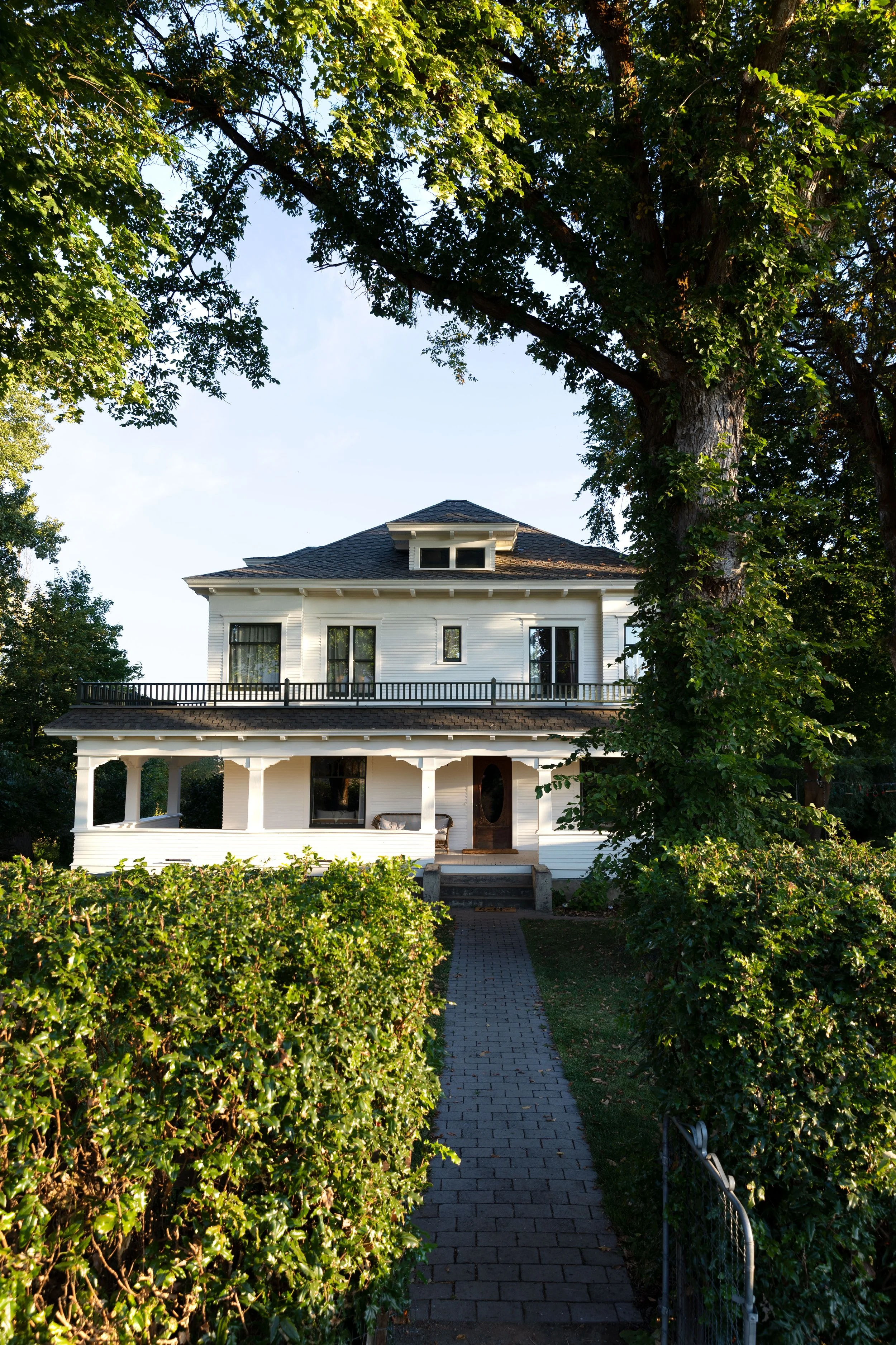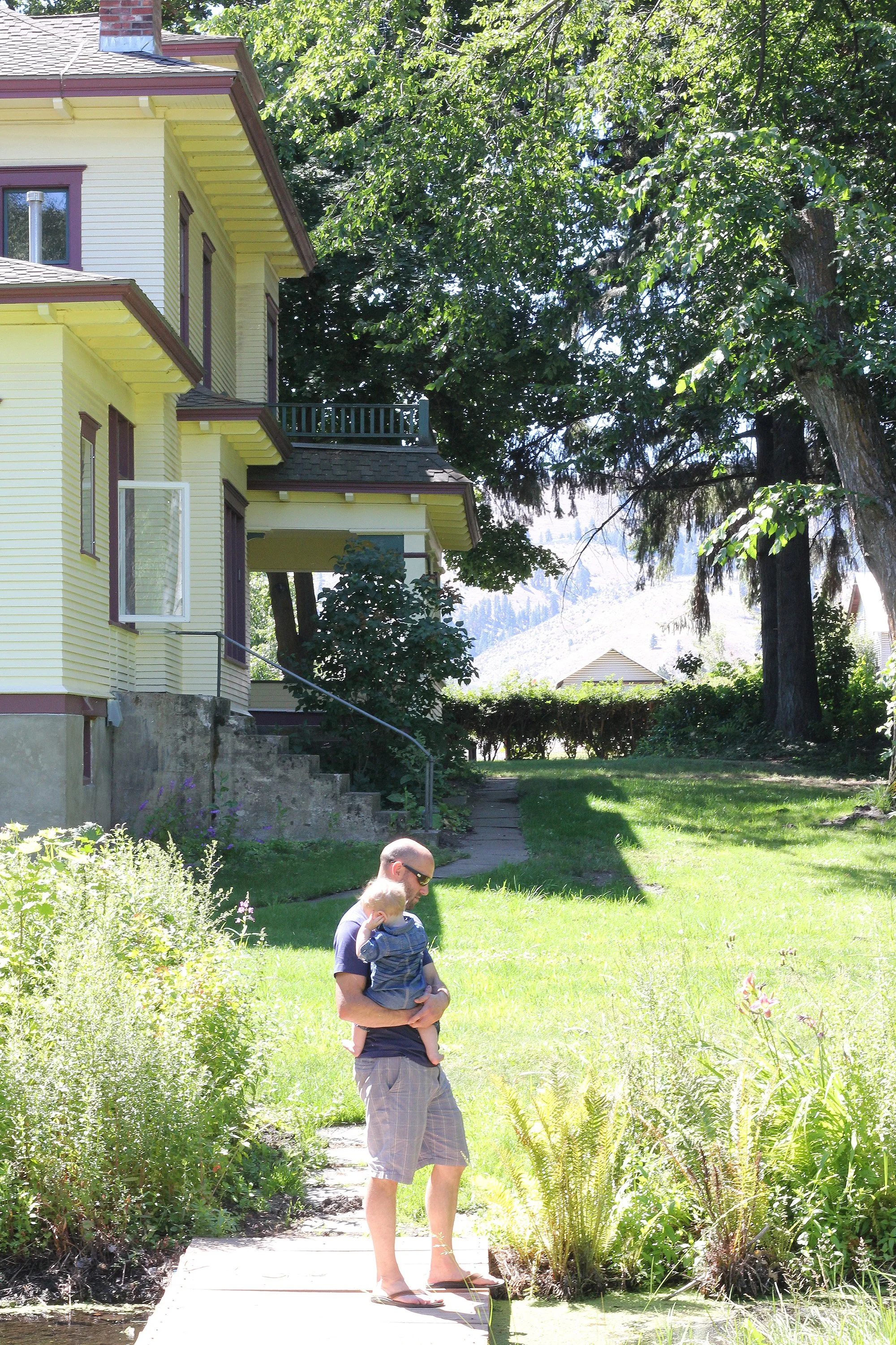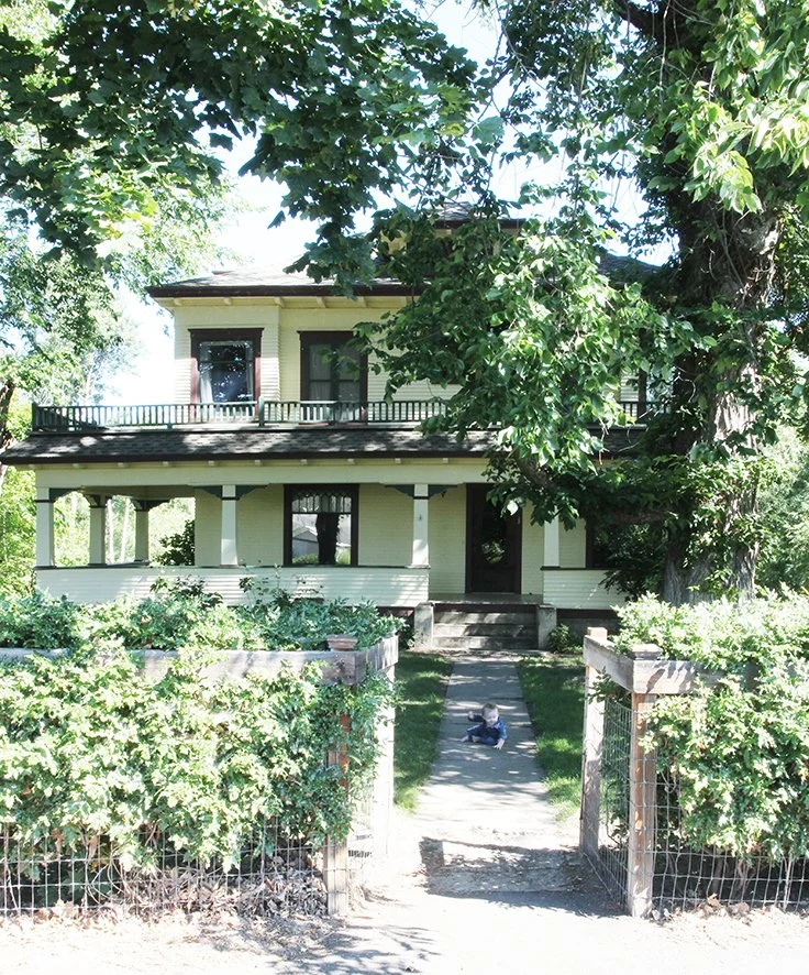Here’s a before of the yellow, maroon, and green paint on the day we moved in. That’s our middle kiddo, then 9 months, now 7, slithering up the walk. This pic really makes me realize how much our hedges (I believe they’re Oregon grape) have grown - they’re probably 7’ tall now!