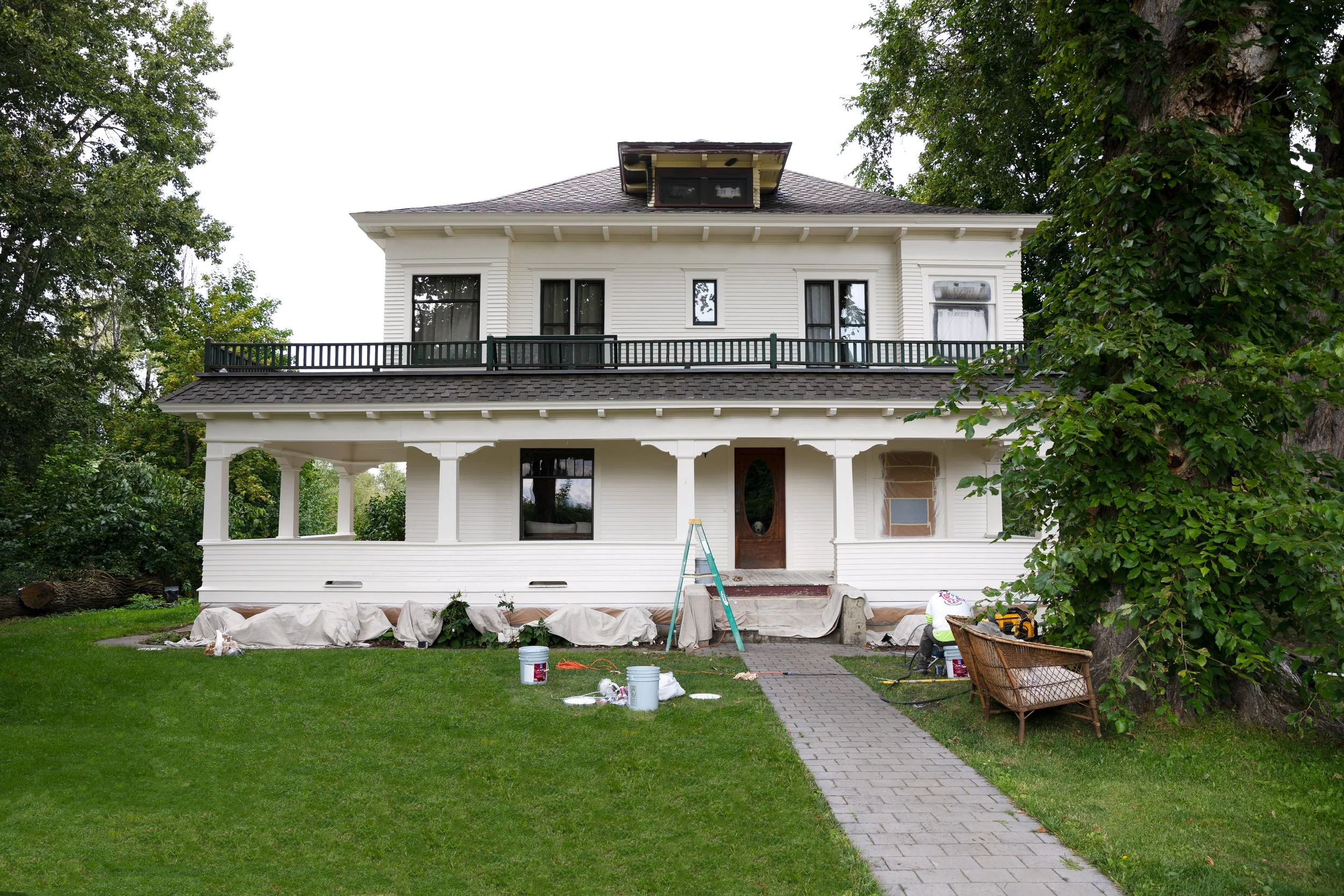 We paid $13,000 + tax for the paint and labor involved. Jose also bid the porch rail at $1,500 but we opted to do that ourselves (it needed a lot of rehab and you can see more about that here). We have gotten a few other bids over the years to paint the Farmhouse and that’s pretty close to what the other’s came in at. We ended up picking Jose because (1) he was already working in our area and (2) we looked him up on google and he had an average rating over 4.5 (which is great for a contractor!), and (3) he had availably (everyone else we’ve talked to is 6 months -12 months out). We also looked Jose’s company up on our state’s contractor lookup site to make sure he was licensed and insured and in good standing before hiring him.